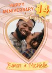 Front of card: Photo Upload Anniversary Card Heart shaped photo frame on a pink striped background. Text reads: "Happy anniversary 14 happy years Simon & Michelle". '14' and 'Simon & Michelle' can be personalised!