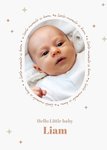 Featuring a central circular photo upload frame surrounded by the repeated phrase “a little miracle is born” in soft handwritten text. The design sits on a white background decorated with small pastel stars.