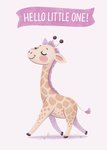 Sweet illustration of a smiling giraffe with purple accents walking proudly under a lilac banner on a pale pink background.