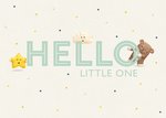Front of card: Featuring an illustrated word "Hello little one" surrounded with cute star & cloud characters and a bear peeping from behind the letter "O", all on a white background with coloured polka dots.