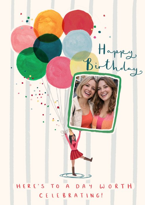 Featuring a large bunch of colourful balloons with an illustrated girl in a party hat holding the balloon strings. The design has 1 photo frame and sits on a cream striped background scattered with multicoloured confetti.