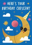 Illustration of a smiling crescent moon wearing sunglasses and a party hat, holding a pink balloon, surrounded by clouds and stars on a blue background.