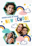 Front of card: New School Photo Upload Card Hexagon photo frames surrounded by clouds and rainbows. Text reads: "Good luck at your new school Charlie". 'Charlie' can be personalised