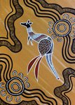 Illustration of a kangaroo on brown background with Aboriginal art pattern.