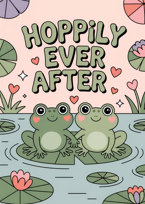 An illustrated greeting card featuring two smiling cartoon frogs sitting on lily pads with hearts and water plants, on a pink and light blue background.