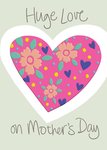 Front of card: Bright and simple illustration of a large patterned heart. The central heart is surrounded by hand drawn text. Text reads: "Huge love on Mother's Day."