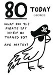 Front of card: Bold black line drawing illustration of a parrot wearing a pirate hat with a skull and crossbones on it, and an eye patch. Above is black text with a large 80 today and an editable name at the top. All on a white background. Text reads:"80 today George. What did the pirate say when he turned 80? Aye matey" " With customisable name.