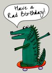 Featuring an illustration of a crocodile riding a skateboard with a speech bubble above its head on a light grey coloured background.
