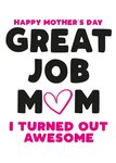 Front of card: Funny Mother's Day Card Humourous black and pink typography on a white background with a heart for the 'u' in the word mum. Text reads: "Happy Mother's Day great job Mum I turned out awesome".
