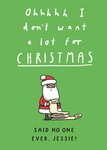 Front of card: Featuring a funny festive illustration of Santa with a long wish list. Text reads: "Ohhhhh I don't want a lot for Christmas said no one ever, Jessie!". 'Said no one ever, Jessie!' can be personalised!