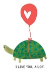 Featuring an illustration of a green turtle with a red balloon with a white heart shape is tied to its shell with a string, floating above.