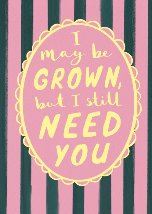 Featuring a Mother’s Day greeting card with a large pink scalloped oval in the centre on a pink and dark green striped background, with yellow hand-lettered writing.