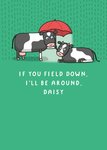 Features an illustraion of 2 cows. Text reads "If you field down, I'll be around DAISY".
