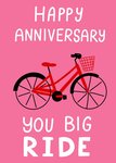 Illustration of a dark red bike on a pink background with whote text above and below it.