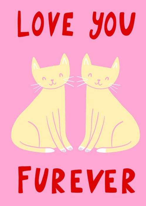 Illustration of two yellow cats on a pink background with red text above and below them.