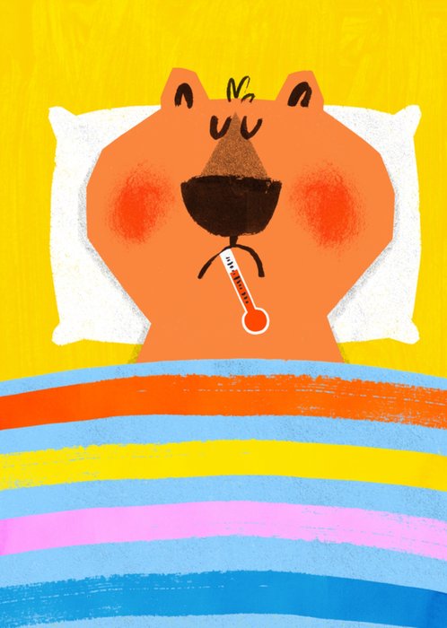 A colourful design featuring a cute illustrated bear tucked up in bed with a thermometer and a striped blanket on a yellow background.