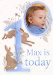 Cute illustrated photo upload card with large blue number 1, floral outlines and illustrated rabbits