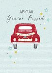 Front of card: Illustrated red car with 'Well done' sash and 'You did it' sign on patterned background. Text reads: "Abigail You've Passed" With editable name.