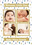 Four golden photo upload frames with text above and below on golden strips. All of which on a white background spotted with various colours. Text reads "Welcome Little One" above and"Baby Neiece Gracie" Below. Text below can be edited. Back of card: Helen butler logo on a white background