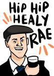 Illustration of Michael Healy-Rae with pint in hand and text above