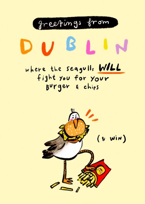 Non editable text reads: Greetings from Dublin where the seagulls WILL fight you for your burger & chips.