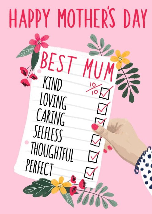 Front of card: Illustration of a white hand holding a list that rates all the things best Mums have. Text reads: "Happy Mother's Day. Best Mum: Kind, loving, caring, selfless, thoughtful, perfect. 10/10 tick."
