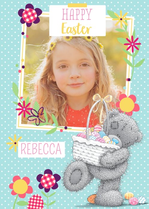 Front of card: Illustrated multicoloured easter eggs on a white background, surrounding text that reads: "Happy Easter Sophie". The top half of the card contains a photo upload frame. "Sophie" is editable.