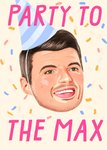 Featuring an illustrated man's face wearing a blue striped party hat with colourful confetti on a cream coloured background.