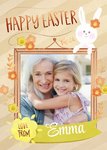 Front of card: Photo upload frame in center of card surrounded by illustrated orange, yellow and pink flowers on a brown striped background. Frame also has an easter bunny at the top right of the frame. Text reads: "Happy Easter love from Emma." Emma is customisable.