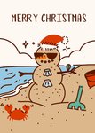 Features An illustrated scene of a snowman made out of sand on a beach.