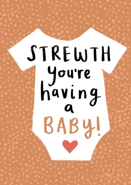 Front of card: Pregnancy Card Illustration of baby grow with handwritten text on a speckled peach background. Text reads: "Strewth you're having a baby!".