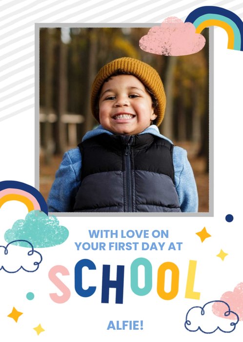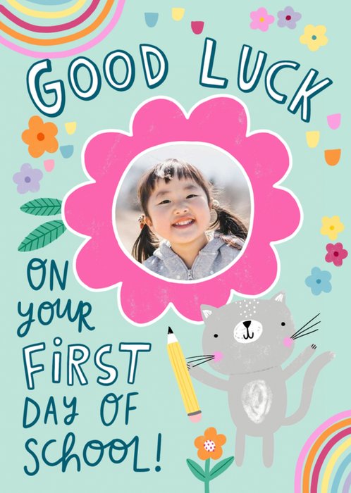 Front of card: First Day Of School Photo Upload Card Illustration of a cat with colourful flowers on a teal background. Text reads: "Good luck on your first day of school!".