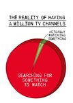 Front of card: Humorous 'a million TV channels' Birthday Card Illustration of a colourful pie chart. Text reads: "The reality of having a million tv channels", "searching for something to watch" and "actually watching something".