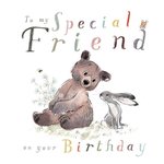 Front of card: To My Special Friend Birthday Card Illustration of a cute bear and a hare with colourful typography. Text reads: "To my special friend on your birthday".