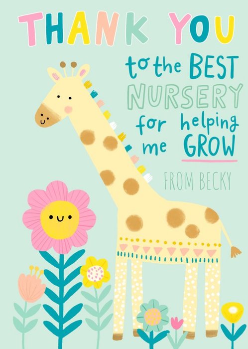Front of card: To The Best Nursery Thank You Card Illustration of a giraffe and colourful flowers. Text reads: "Thank you to the best nursery for helping me grow from Becky". 'From Becky' can be personalised!