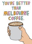 Front of card: You're Better Than Melbourne Coffee Card Illustration of a hand holding a cup of coffee. Text reads: "You're better than Melbourne coffee.".