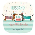 Front of card: Husband's 40th Birthday Card Illustration of a pair of sausage dogs with a birthday cake. Text reads: "Husband" and "Happy 40th birthday have a great day". All text can be personalised!