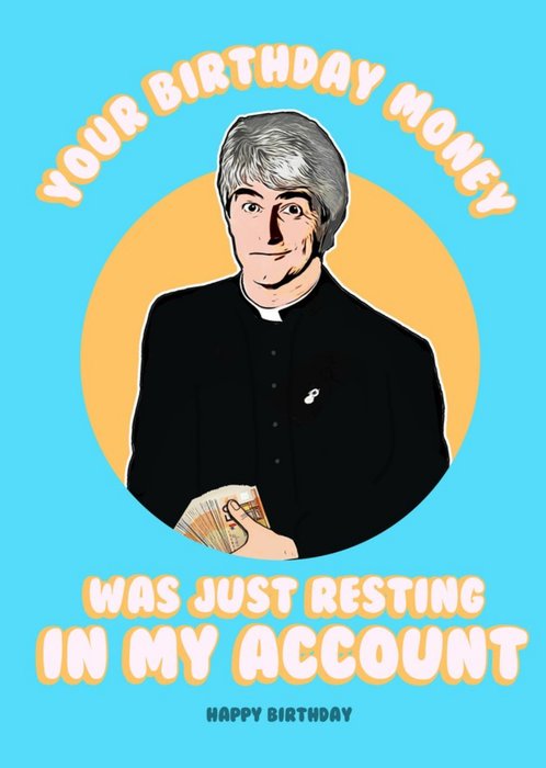 Front of card: 'Your birthday money' Humourous Birthday Card Illustration of Father Ted with bold white text on a blue background. Text reads: "Your birthday money was just resting in my account" and "happy birthday".
