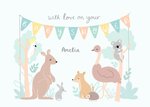 Front of card: Baby Shower Card Illustration of various animals under a bunting. Text reads: "With love on your baby shower Amelia". 'Amelia' can be personalised!