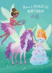 Front of card: Cute illustrated fairies with a purple unicorn on a green background with an editable name. Text reads: "Have a magical birthday Lilly" With customisable name