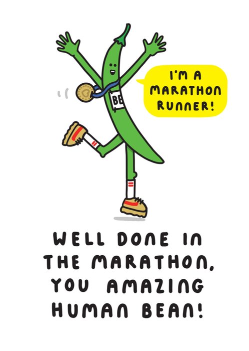 Featuring a cartoon green bean marathon runner wearing trainers, a race bib and a medal, with a yellow speech bubble on a white background.