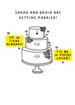 Front of card: Featuring a funny illustration of a three tier wedding cake. Text reads: "Sarah and David are getting married! I'm in tiers already! I'll be in pieces later". 'Sarah and David' can be personalised!