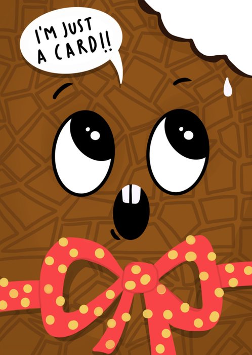 A fun, playful design featuring a cute cartoon chocolate bar character with a red polka dot bow and a speech bubble with a humorous message.