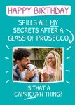 Front of card: Featuring white handwritten typography with a photo frame on a teal background. Text reads: "Happy birthday spills all my secrets after a glass of prosecco is that a Capricorn thing?".