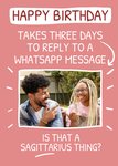Front of card: Featuring white handwritten typography with a photo frame on a pink background. Text reads: "Happy birthday takes three days to reply to a WhatsApp message Is that a Sagittarius thing?".