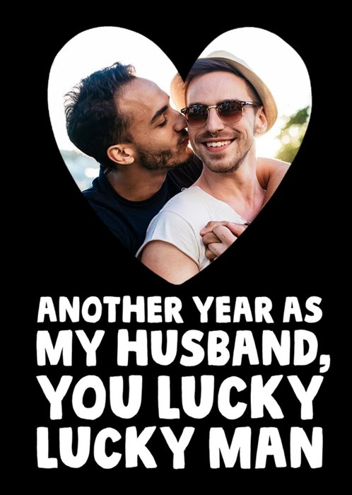 Front of card: Illustrated lettering with a big heart photo upload on a black background. Text reads: "Another year as my husband, you lucky lucky man."