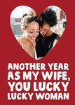 Text reads: "Another year as my wife, you lucky lucky woman."
