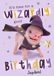 "It's time for a wizardly good birthday Jayden". 'Jayden' can be personalised!