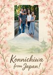 Front of postcard: Painted soft pink cherry-blossom branches frame your own photo, set above a dreamy watercolour scene of Mount Fuji and tranquil pagodas.