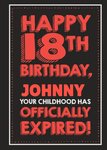 Front of card: Red and white typography on black background with border Text reads: "Happy 18th birthday, Johnny your childhood has offically expired!"